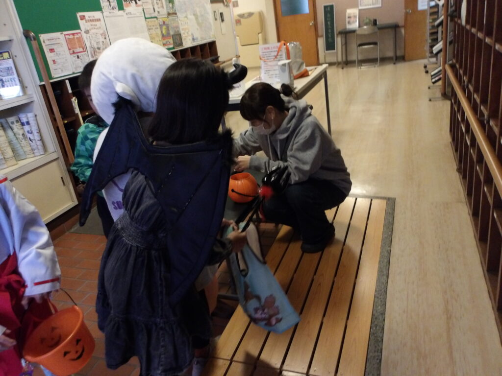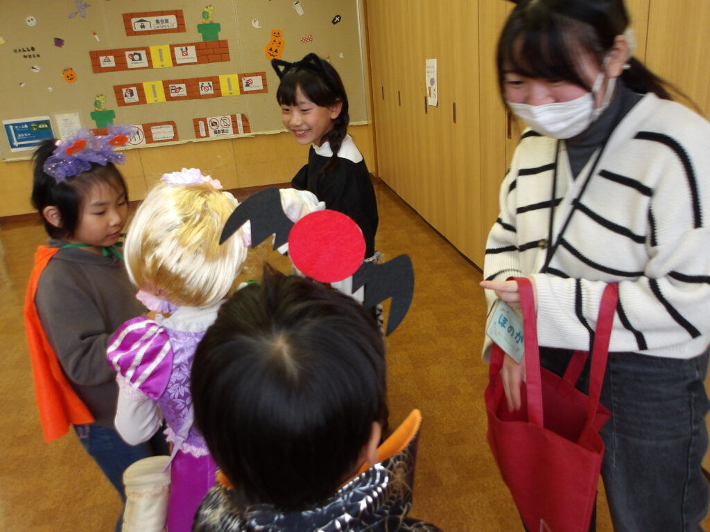 最初はお菓子探しゲーム!「トリックオアトリート」の合言葉を職員に伝えるとお菓子がもらえるゲームです。