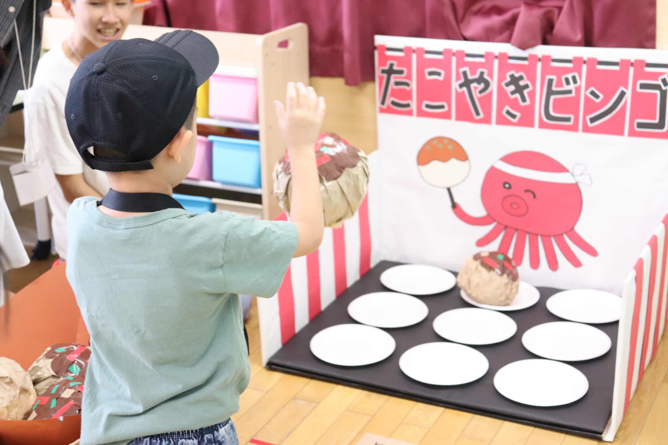 ゲームコーナーのたこ焼きビンゴ。縦横ななめのどれかに並ぶとビンゴ!皆ビンゴになったかな。