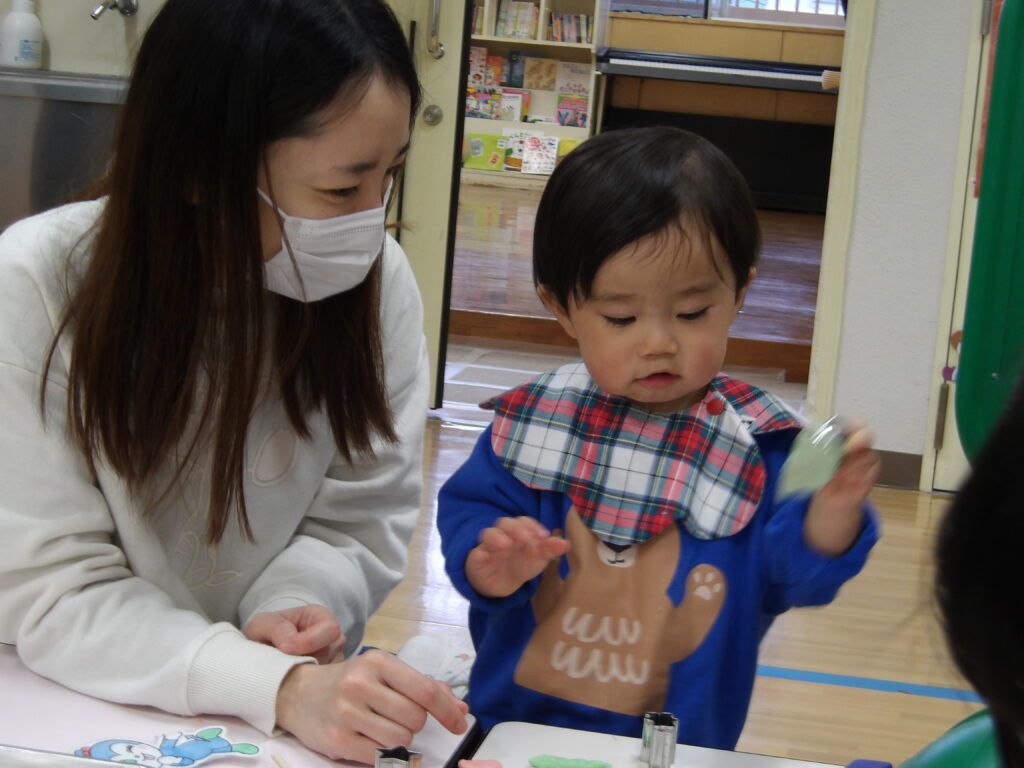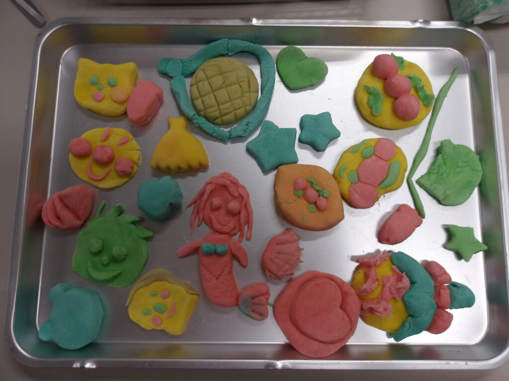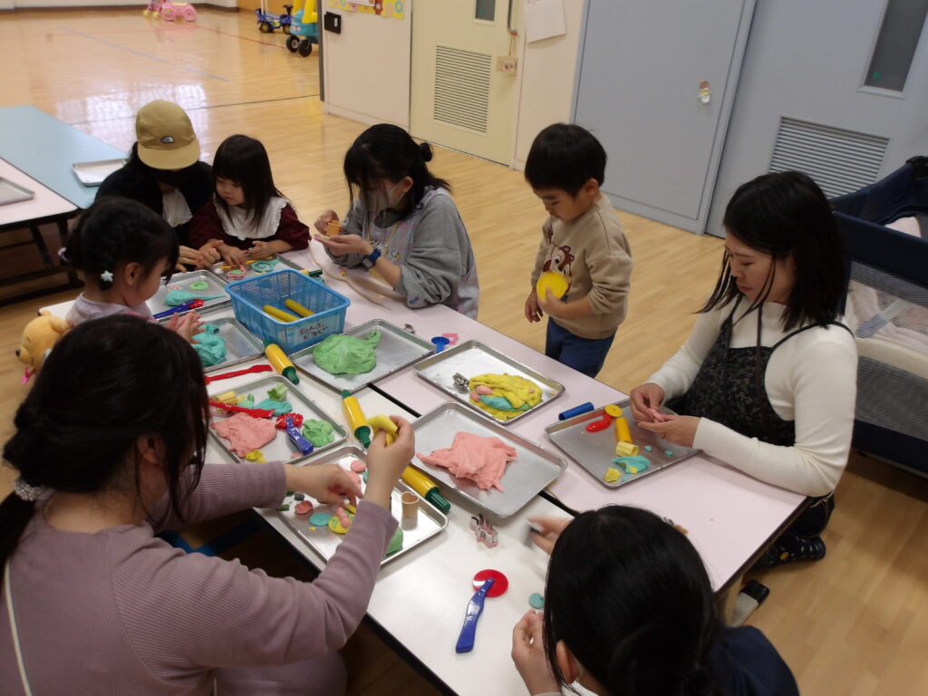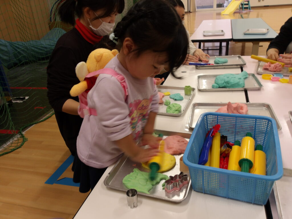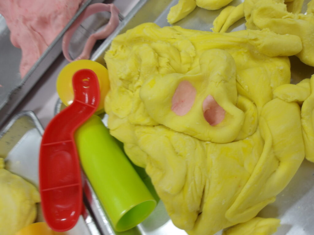 今月の感触あそびは「小麦粉ねんど」をしました。