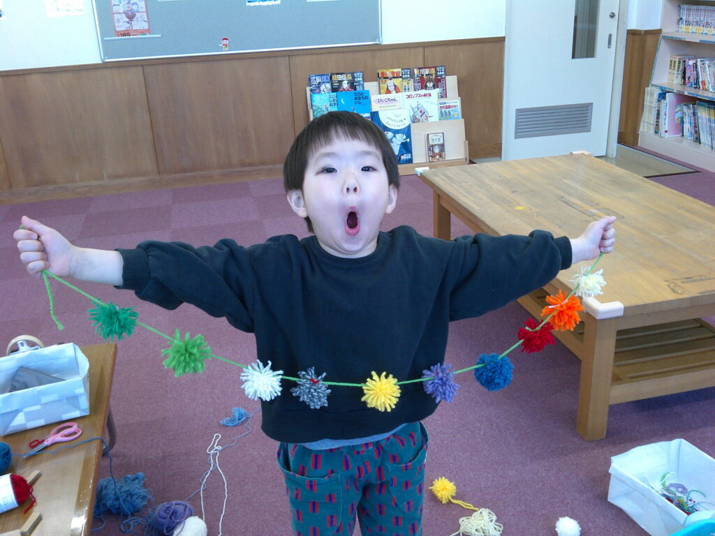 🎈ころころタイム🎈 $CoMmEnt^ 2026.02.28 富士見児童館ふじみじどうかんでは未就学児親子みしゅうがくじおやこ向けむ のイベントも開催かいさいしています🐤 1月がつのころころタイムでは「毛糸けいとのぽんぽんガーランドをつくろう」を実施じっししました🧶 「10個こ作つくりたい!」とやる気満々きまんまんで参加さんかしてくれました✨ お兄にいちゃんがぽんぽんを作り、お母かあさんがはさみで切きって10個無事こぶじに完成かんせいしました🧵 カラフルなガーランド、素敵すてきだね🎶