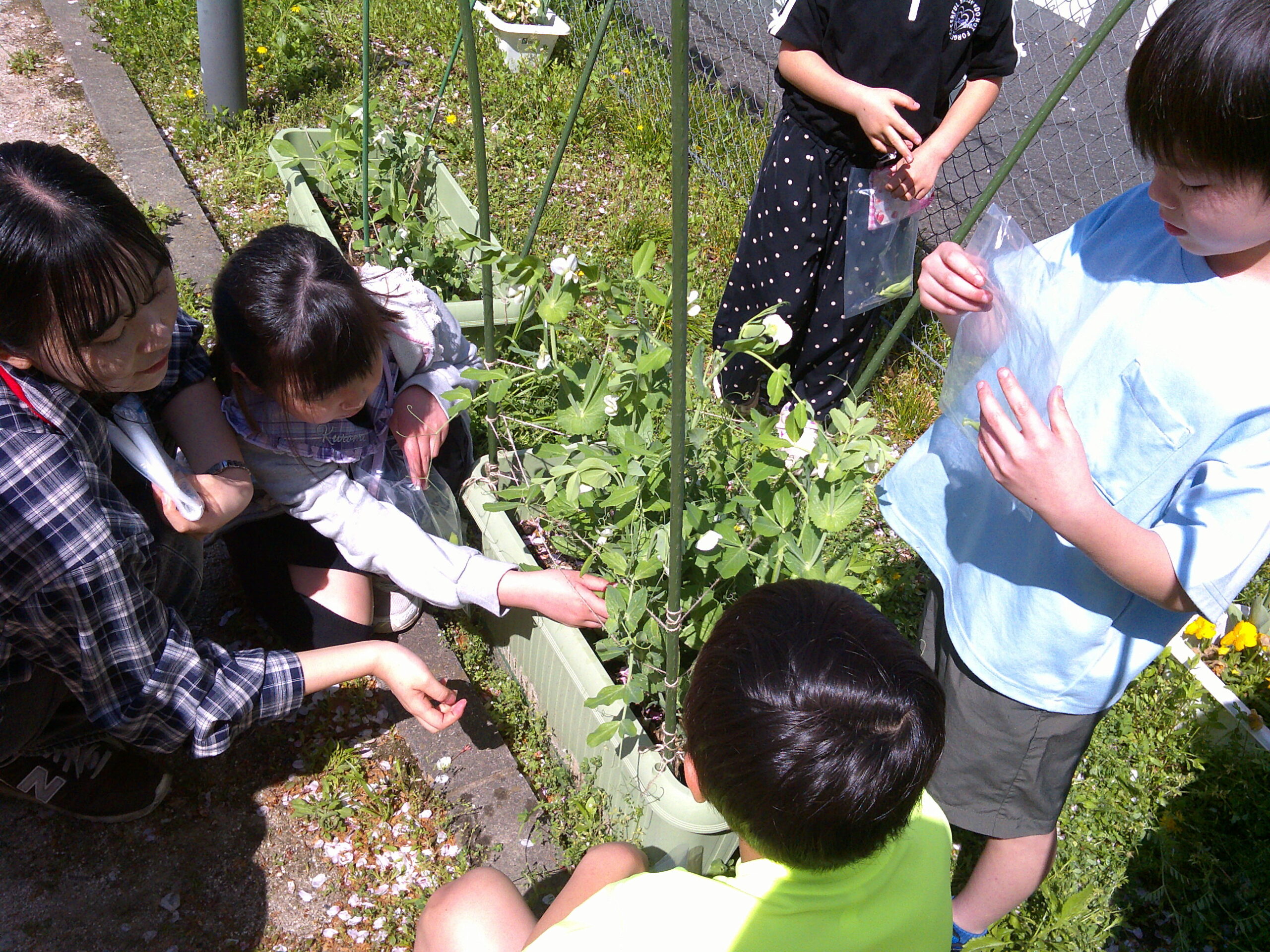 🥬スナップエンドウ🥬 $CoMmEnt^ 2026.04.17 館庭かんていのプランターで栽培さいばいしていた『スナップエンドウ』を収穫しゅうかくしました! 子こどもたちは「やりたい!やりたい!」とすぐに外そとに出でる準備じゅんびを始はじめてくれました👧👦 学童がくどうの子こどもたちも一緒いっしょに、収穫しゅうかく!! 今いまはまだ小ちいさくて収穫しゅうかくできないスナップエンドウもあったね💦 また大おおきくなったらみんなで一緒いっしょに収穫しゅうかくしようね🌸
